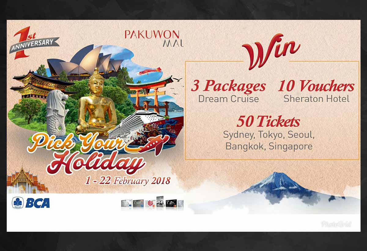 Dalam rangka menyambut anniversary pertama yang jatuh pada 22 Februari 2018, Pakuwon Mall mengadakan program Pick Your Holiday. Belanja dan tentukan destinasi liburanmu sendiri. Diantaranya 3 paket Dream Cruise, 50 tiket pulang pergi ke Sydney, Tokyo, Seoul, Bangkok, Singapore, serta 10 voucher menginap di Sheraton.
